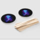 Gran medusa azul, de dibujo artístico, brillante y brillante, con largos tentáculos sobre fondo negro con bioluminiscencia violeta. Luminosas medusas.