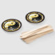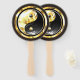 Joyería, oro y símbolo yin yang negro sobre fondo negro. Oro yin yang.