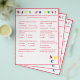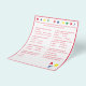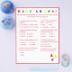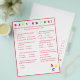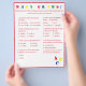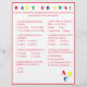 El diseño presenta un fondo blanco en un borde rojo y texto rojo. El título se muestra en colores brillantes. Las preguntas son múltiples opciones y están relacionadas con el desarrollo del bebé. La última pregunta, sin embargo, es personalizable y es personalizada para la futura mami. Las letras estampadas "ABC" se muestran en la esquina inferior derecha en colores primarios. Las respuestas se encuentran en la parte posterior. Diseñado para coordinar con la "colección Baby Shower ABC". También disponible en azul.