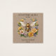 Una tarjeta de visita sobre un fondo de papel kraft en el que aparece una abeja de miel rodeada de flores.