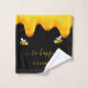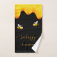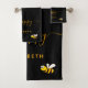 Un fondo negro de moda decorado con miel de goteo dorada. El texto: Abeja feliz con un guión de estilo con letras a mano dorada con chispas. Personaliza y agrega tu nombre. Perfecto para su casa de verano o de vacaciones.