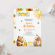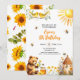 Abejas, oso bebé, una colmena, pequeños pájaros y flores amarillas en la parte delantera y simpáticos girasoles en la espalda. Puede personalizar esta invitación con sus propios detalles.