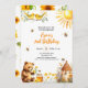 Abejas, oso bebé, una colmena, pequeños pájaros y flores amarillas en la parte delantera y simpáticos girasoles en la espalda. Puede personalizar esta invitación con sus propios detalles.