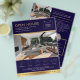 Volante de marketing Modern House For Sale con fotos, su logotipo, detalles de contacto e información de propiedad. Este folleto de la casa abierta color azul marino personalizable y oro falso presenta un diseño moderno con espacio para 5 fotos, elegantes motivos dorados, espacio para los detalles de la propiedad con iconos para cada uno y su texto personalizado. Un diseño profesional de volante para ayudarle a anunciar un anuncio de propiedades o un evento de puertas abiertas para compradores potenciales.