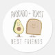 Un pegatina con un ilustracion personalizado de aguacate y una tostada con rostros. El texto dice "Aguacate + Toast Best Friends".