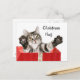 Los alcances de plata jovenes del gatito del tabby fuera de una caja de regalo roja para dar a navidad abrazan la tarjeta de felicitación de la foto del día de fiesta
