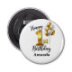 A perfect party favor for guests! This personalized button bottle opener is designed for a baby's 1st birthday or baby shower. It features an elegant design with a large faux gold number '1' and a festive cluster of metallic gold and white balloons on a clean white background. Fully customizable with the child's name, this opener is a practical keepsake for adult guests