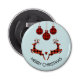 Un abrebotellas que dice "Feliz Navidad" en texto curvo. Diseñado con un ilustracion de 2 ciervos Navidades saltando. Los ciervos están hechos de leñadores rojos y negros, con un poco de corazón entre ellos. Las decoraciones de Navidad rojas y negras se cuelgan desde arriba.