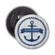 Apertura de botellas con ancla náutica azul oscuro rodeada por un borde de cuerda sobre un fondo de marisco gris claro. A lo largo del ancla hay una cinta azul con un campo de plantilla para el nombre del barco u otro texto personalizado.