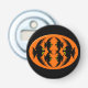 Este increíble abrebotellas de botón presenta un oval naranja con seis cuervos. Cada cuervo tiene ojos amarillos con pupilas negras y alas estiradas. Los cuervos están volando unos hacia otros formando una forma oval. El fondo es negro.