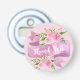 Abrebotellas rosa claro femenino y bonito con las palabras "Gracias" en una elegante escritura blanca, con un fondo de cinta de terciopelo púrpura lila. Dos hermosas disposiciones florales de acuarela primaveral con rosas rosadas y vegetación completan el diseño. ¡Este abrebotellas femenino y caprichoso sería un regalo perfecto!