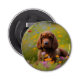 Este abrebotellas tiene un lindo espátulo de cocker marrón en un campo de flores silvestres.