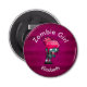 Un abridor de botellas personalizado que dice chica zombie. Con un lindo ilustracion chica zombie con pelo rosado caliente y piel moralmente verde. Usando atuendo con temática de roca de punk. Sus brazos se extendían buscando bragas. Está situado sobre un fondo de color gris magenta oscuro con rayas descoloridas. Personaliza con un nombre.