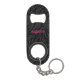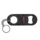 Una divertida impresión de leopardo negro sobre carbón cubre este abrebotellas de llavero personalizado con su nombre impreso en letras rosa caliente chic en la parte delantera y trasera.