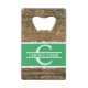 Abridor de frascos de tarjeta de crédito de doble cara. Personalizar este abridor con un nombre y delante y atrás iniciales. Efecto rústico *de madera marrón templada. Verde y blanco. *no madera real