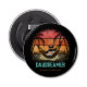 Abridor de botellas de escape tropical de un gato Guay ideal para el sueño: un gato negro que usa gafas de sol y una camisa hawaiana que descansa en una hamaca entre dos palmeras, con una puesta de sol retro al fondo.