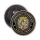 El emblema nacional de Puerto Rico está en el centro de un diseño circular. El color de fondo es un gradiente radial negro/blanco, y alrededor de las llantas de los círculos, es un color falso dorado. El texto sobre el diseño presenta el título oficial de Puerto Rico, mientras que el texto inferior es el lema, que se traduce como Isla de Encanto.