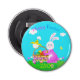 Un lindo conejito rosa sostiene una canasta de Pascua llena de coloridos huevos de Pascua, una chica recién nacida y un mensaje de "Pascua feliz".