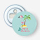 abridor de botellas festivo con un lindo ilustracion de un flamingo rosado en un sombrero de santa rojo. Junto a una palmera verde sobre un montón de arena amarilla. Se coloca un diseño de flamante árbol de navidad junto al texto Feliz Navidad. Escrito en el color rosa en un lujoso tipo de letra manuscrita. Fondo verde pastel.