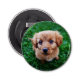 Adorable fotografía de retrato de un cachorro sentado en el pasto mirando a la cámara.
