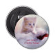 Un abridor de botellas con una fotografía de un gatito sentado sobre un suave sombrero blanco y rojo de Santa. Luces brillantes borrosas cuelgan el fondo. Un juego de palabras gracioso - Navidades Meowy. El texto es editable, así que puedes cambiarlo y decir lo que quieras.