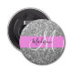 El purpurina glamuroso y grisáceo/plateado esparce el nombre del monograma blanco y el abridor inicial del frasco. Su nombre personalizado y su monograma están escritos en un guión elegante con letras a mano con un fondo rosado. Puede cambiar el color del texto y el estilo y el tamaño del tipo de letra mediante la opción personalizar. ¡Un regalo perfecto de cumpleaños o Navidades!