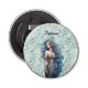 Una hermosa sirena con el largo cabello azul sobre un fondo de verde azulado con un patrón de concha y frontis.