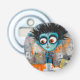 Un personaje colorido, con ojos grandes y expresivos y cabello espiado, adornado con objetos circulares, mira hacia afuera, sentado en una mesa llena de notas de papel y tazas de café. Detrás de la figura, el vibrante fondo está lleno de garabatos tipo graffiti, yuxtaponiendo el caos urbano con el del personaje