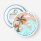 Apertura de botellas de vibración clásica de playa con divertida imagen de Ilustracion retro de color de palmeras verdes, olas azules, sol naranja y rayos solares amarillos y rosados en un patrón de textura de fondo falso de corcho. Rodeado de palabras relacionadas con el verano... Olas, Fiestas de playa, buenas vibraciones, cócteles, verano, amigos, risas, sol y surf. Abridor de botellas Guay para uso en fiestas de playa o patio trasero y para ser práctico en el patio o en el bar tiki junto a la piscina.