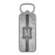 Un abrebotellas magnéticas en un gris gris gris gris oscuro con una franja vertical gris oscuro y un lugar para personalizar con tu inicial. Hace una buena idea de regalo.