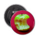 Foto de una gran manzana verde sobre fondo rojo. La mordedura grande ha sido sacada de la manzana.
