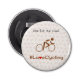Este abridor de botellas tiene un fondo de color marrón pálido, con un patrón suave de hojas de roble inspirado en la conducción a través de las hojas caídas del otoño. El eslogan simple en un texto marrón oscuro con un corazón rojo es #LoveCycling, y hay un pictograma de un ciclista encima. Agregue un pie de foto o utilice el predeterminado "One for the road..". Genial para una celebración fiesta.