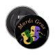 Este colorido abrebotellas presenta una máscara trágica y cómica en los colores tradicionales del Mardi Gras, malva, verde y dorado, con un fondo negro. Perfecto para fiestas y celebraciones del Martes de Grasa o Mardi.