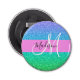 El purpurina de sirena azul grisáceo y azul glamuroso, verde, agua y turquesa deslumbra el nombre del monograma gradiente y el abridor inicial del frasco. Su nombre personalizado y su monograma están escritos en un guión elegante con letras a mano con un fondo rosado. ¡Un regalo perfecto de cumpleaños o Navidades!