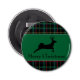 Tartán negro, verde y rojo con banda verde festiva y silueta de reno sobre abrebotellas magnéticas.