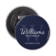 Añada un toque personal a su boda con el abridor personalizado de frascos de los padrones. Este abrebotellas presenta el nombre del groomsman personalizado en estilo de letra de escritura clásico blanco con detalles bodas en estilo de letra serif clásico blanco y monograma en estilo de fuente serif clásico azul marino claro como fondo, sobre fondo azul marino. También perfecto para el mejor hombre, padre de la novia, portador de anillo y más.