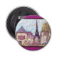 Este arte de estilo puntillista es un paisaje inspirado en París, Francia, la Torre Eiffel y las fachadas de la tienda dentro del casino y complejo de París Las Vegas, obra de Kristie Hubler sobre este barato abrebotellas
