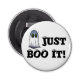 Sólo Boo It1 con letras negras divertidas que tiene los ojos en la parte superior de algunas de las letras. A la izquierda de las letras hay un fantasma blanco con sombras moradas y agujeros verdes ovalados espeluznantes para los ojos. Diversión por un pequeño trato de Halloween.