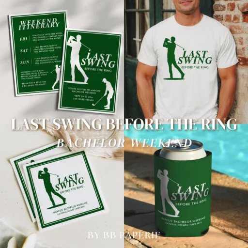 La suite The Last Swing Before the Ring es una colección refinada para despedida de soltero inspirada en el golf que combina el encanto preppy con un toque de espíritu juguetón. Con una audaz silueta de golfista en verde intenso y blanco crujiente, esta colección presenta el diseño perfecto para una celebración con clase en el campo de golf. Con líneas limpias, estilo atlético y tipografía atemporal, esta suite está hecha para novios que prefieren cambiar votos después de una última ronda con los muchachos.