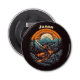 Ciclismo Vida, pintura retro en naranja y azul de un ciclista que recorre las montañas y el bosque con el sol en el fondo