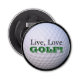 Este abrebotellas redondas tiene una imagen de una pelota de golf blanca sobre fondo negro con un texto que dice, "¡Viva, Ama, GOLF!" en ella con letras en negro y verde. Se convertiría en una divertida adición a la bolsa de golf, cueva masculina, cueva o salón de recetas y es un gran regalo para el ávido golfista.