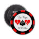 Boda de fichas de póquer favorece el abridor de botellas de cerveza magnéticas. Diseño de novedad con iniciales monogramadas de novia y novio. Personalice su ubicación, fecha o valor, etc. Moneda de marcador redondo negra y roja con corazones y símbolos de pan. Diseño de Guay para el matrimonio temático de Las Vegas.