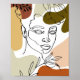 Una colorida imagen moderna de la cara de una mujer en estilo monolítico con formas abstractas neutras y hojas que la rodean.