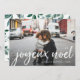 Envía saludos navideños a amigos y familiares con estilo invernal elegante con nuestras elegantes tarjetas de foto. Tu foto favorita está superpuesta con el saludo navideño francés "joyeux noel" en tipografía blanca dibujada a mano, con tus nombres y el año debajo. Las tarjetas se revierten a nuestro patrón de Abundancia de Invierno de exuberante follaje botánico verde sobre un fondo blanco crujiente.