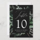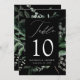 Elegantes tarjetas botánicas de mesa boda con el número de la mesa, los nombres y la fecha boda enclavadas en un marco rectangular rodeado de eucalipto, helechos y otros ricos paisajes de fondo negro. Personalice el número de cada tarjeta de tabla y agréguela a su carrito. Las tarjetas de mesa 5x7 fueron diseñadas para coordinar con nuestra colección Abundant Greenery boda.
