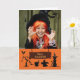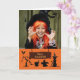 Los gatos, murciélagos y brujas gorras se ven en la parte inferior del naranja de la tarjeta en silueta negra. Una araña y murciélagos se colgarán encima de la foto. ¡Buen recordatorio del disfraz del año pasado para el truco o el traidor!