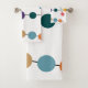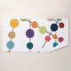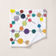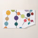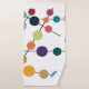 Este conjunto de toallas tiene un diseño moderno de mediados de siglo de líneas negras con círculos de diferentes colores y tamaños sobre un campo de blanco.