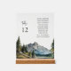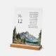 Señal de la mesa con número de la mesa y nombres de invitados, símbolo de la parte superior de la mesa de la tabla de asientos con vistas a las montañas acuáticas con el lago.