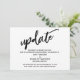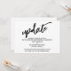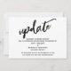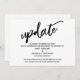 La distinción de este conjunto se debe a la fuente moderna de escritura a mano que se utiliza para las frases de acento. En el caso de que necesite informar a sus invitados de que su boda ha sido cancelada, esta tarjeta ofrece una opción audaz y llamativa. En esta pieza, se utilizó la fuente de escritura a mano para crear un gráfico simple que representa la palabra "actualización". Utilice los campos de la plantilla para agregar sus datos personales y hacer que este diseño moderno y único sea suyo. El fondo blanco se puede cambiar a cualquier color que prefiera. Por favor, comuníquese con nosotros para cualquier solicitud especial o para obtener ayuda para personalizar. // 100 //