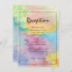 Para una boda colorida y animada, considere un conjunto de invitaciones que incluya una caprichosa pintura abstracta de acuarela en una variedad de tonos alegres. La pintura es la misma en ambos lados; la parte frontal incluye un borde delgado gris oscuro y su información en gris oscuro. Los tonos amarillos, rosados, morados, azules, verdes y turquesas sugieren un teñido de moda y genial. El texto para su información personalizada es fácil de personalizar utilizando las plantillas de texto y el menú de edición. ¡Un conjunto de invitaciones de boda verdaderamente único! Arte y diseño original y caprichoso de Tuzi Williams.